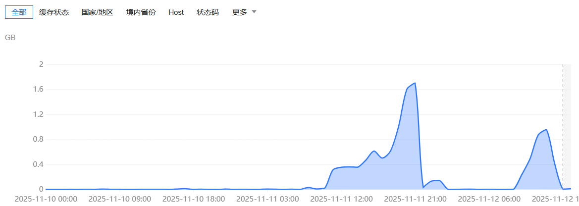 闲来无事的下午,调整了一下博客主题的格式,于是上腾讯云管理面板清空一下EdgeOne的缓存,结果发现11月11日的下午到晚间以及12日的上午,流量暴涨合计11GB,访问次数达到2.33万次。
