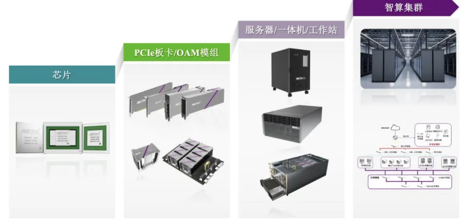 根据上图,我们可以清晰的看到,摩尔线程的 GPU 已经迭代了四代,其中消费级使用二代,AI 智算使用四代芯片。围绕芯片核心,拓展了板卡、一体机/服务器、集群设备三种形态,如下图(示意图,与摩尔线程无关)